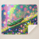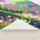 Ein lebendiger grüner Grasshopper klettert auf eine farbenfrohe, traumhafte Piste, umgeben von leuchtenden Orben und üppiger Vegetation. Der Hintergrund strotzt vor einer blendend großen Auswahl an Licht und Farbe, was eine surreale, verzauberte Umgebung schafft.