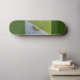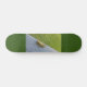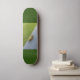 Ein dunkelgrünes 7 3/4 Skateboard, mit einem Bild eines Grasshoppers, auf einer Veranda, die darauf gleitet.