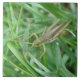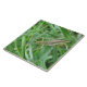Diese phantastische Kachel zeigt ein detailliertes Makrofoto eines kleinen grünen Grasshoppers mit braunen, mottelierten Markierungen auf dem Gras. Auf dem Foto sehen Sie die Details der geflochtenen Beine, lange Antennen und schwarz-goldene Augen des Grashüpfers.