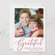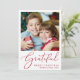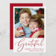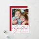 Elegante saisonale Urlaubskarte mit Ihrem Foto und "Grateful" in einem stilvollen roten Drehbuch. Personalisieren Sie Ihren Gruß ("Happy Holidays", "Frohe Weihnachten" usw.) und fügen Sie Ihren Namen und das Jahr hinzu.