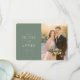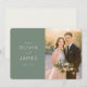 This wedding thank you card features a split layout with a solid green background on the left and a warm, golden-hued photograph on the right. The elegant script font highlights "thank you" at the top, followed by names in larger serif letters, creating a sophisticated and modern look. Floral motifs in the photo add an organic touch to the design, which balances text and imagery seamlessly for a celebratory mood. Perfect for expressing gratitude after your special day, this card combines classic style with contemporary elements.
