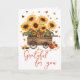 Send a heartfelt note of thanks with this charming card featuring a rustic wooden cart overflowing with sunflowers, pumpkins, and autumn produce. Scattered leaves and warm-toned hearts add a cozy touch, while the “Grateful for you” message makes it perfect for expressing appreciation. The inside is blank—ready for your own personal sentiment.