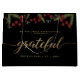 Make your holiday gifting truly memorable with this elegant black gift bag featuring illustrated winter greenery, red berries, and a shimmering gold script that reads “grateful.” Designed for businesses who want to elevate their seasonal packaging, this bag includes customizable text for your company name and year. Perfect for corporate gifting, client appreciation, boutique packaging, employee presents, and festive retail wrapping. A sophisticated, cohesive way to express gratitude during the holiday season.