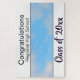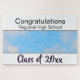 Beschreibung des Entwurfs: Horizontales Design, mit einem weißen Rechteckband oben und unten. Das obere Band hat einen schwarzen unteren Rand, das untere Band hat einen schwarzen oberen Rand. Zwischen den Bändern ist ein horizontaler Raum für Ihr Foto. Das obere Band hat eine zweispurige Textvorlage. Die oberste Textvorlage lautet: "Glückwunsch." Die zweite Zeile des Vorlagentextes hat Platz für einen Studentennamen, einen Schulnamen oder einen anderen Text. Das untere Band hat die Wörter Klasse von, dann eine Vorlage für das Jahr.