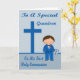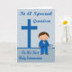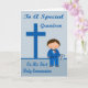 Herzlichen Glückwunsch an Ihren Enkel zu seiner Ersten Heiligen Kommunion mit einem bezaubernden Jungen in einem blauen Anzug mit einer Bogen-Krawatte und niedlicher, rosa Blume auf seinem Laptop mit einer Heiligen Bibel. Hintergrund ist blau mit einem dunkelblauen Kreuz und Text.