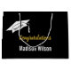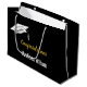 Ein Graduiertencap liegt über dem benutzerdefinierten Text für den Namen des Absolventen in weißem Text auf einer schwarzen Geschenktasche. Im Goldtext der Imitate steht "Glückwunsch". Sie können die Jahresklasse, die in schwarzem Text auf der Akademiekappe steht, anpassen.