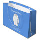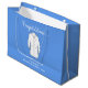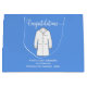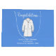 Herzlichen Glückwunsch an die zukünftige Ärztin, Doktor, die ihren weißen Mantel verdient hat. Stilvolles und modernes Design mit Monogramm mit Namen, Veranstaltung und Veranstaltungsdatum. Herzlichen Glückwunsch zum Skriptstil. Blau, weiß und schwarz. Skizzierte einen medizinischen weißen Mantel.