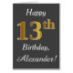 Dieses schlichte Design der Geburtstagskarte zeigt die Meldung "Happy 13 th Birthday", mit dem "13." ein goldenes Aussehen in Imitaten. Es verfügt auch über einen individuelle Name und einen grauen Hintergrund. Es könnte jemandem gegeben werden, der seinen dreizehnten Geburtstag feiert.