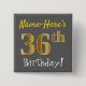 Dieses schlichte Quadrat-Button-Design enthält eine Nachricht wie "Name-Here’s 36th Birthday!", mit dem "36th", der auf grauem (grauem) Hintergrund einen goldfarbenen Imitat/Imitation-Look hat. Der Name kann personalisiert sein. Knöpfe wie diese könnten von Gästen auf einer Geburtstagsfeier getragen werden, die ihren sechsunddreißigsten Geburtstag feiern, wo das Party in einem großen Raum mit vielen anderen Gästen (wie einem Stadtpark oder einem Themenpark) abgehalten wird. [~Z0000192]