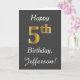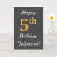 Dieses schlichte Design der Geburtstagskarte zeigt die Meldung "Happy 5th Birthday", die "5th" hat ein goldenes Aussehen in Imitate. Es enthält auch einen personalisierten Namen und einen grauen Hintergrund. Es könnte jemandem gegeben werden, der seinen fünften Geburtstag feiert.