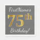 Dieses einfache Papier-Serviettendesign enthält eine Nachricht wie "FirstName's 75. Birthday!", mit der "75." auf grauem (grauem) Hintergrund ein goldenes Imitat/Nachahmung. Der Name kann personalisiert sein. Es könnte auf einer Geburtstagsfeier für jemanden verwendet werden, der seinen fünfundsiebzigsten Geburtstag feiert. [~Z0000190]