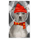 Dieser Pit Bull Hund trägt einen Winterhut und einen gestreiften Schal, um jedem Hundefreund oder Liebhaber, der die Rasse liebt, einen glücklichen Urlaub zu wünschen.