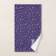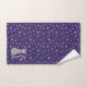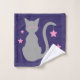 Ein Set mit Handtüchern mit grauer Katze auf lila Hintergrund. Die beiden größeren Handtücher haben die Katze in der Ecke mit einem rosa Sternmuster auf der Erholung des Handtuchs. Das Waschlappen hat die Katze als ein zentrales Design.