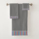 Ein Badetuch-Set mit gestreiftem Akzent in lila, aquamarin und orange, mit einem kohlegrauen Hintergrund, der in jeder Farbe an Ihre stilvolle Zuhause-Badedekoration angepasst werden kann.