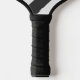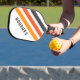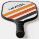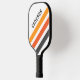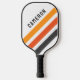 Pickleball Paddel mit drei diagonalen Streifen in dunkelgrau und zwei Orangetönen auf weißem Hintergrund und Ihrem individuelle Name in einem kühlen, modernen Sans Serif Schriftart.
