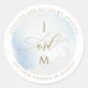 Elegante graue, taupe und blaue Aquarellpinsel streicheln Hochzeitsaufkleber, ideal zum Umschlag Aufkleber von Gunst-Label. Möglichkeit, jede Nachricht, die Sie möchten auf der oberen und unteren äußeren Rand, ideal für Paare Namen und Adresse für Umschlag Aufkleber, oder für Dankeschön Nachricht und Datum für Favoriten. Zentrum mit Paarinitialen mit "und" in anmutiger moderner handgeschriebener Kalligraphie. Hinweis: Typografie ist nicht in realer Folie, sondern in goldener Farbe gedruckt. Teil unserer Kollektion "Blue with Blush or Grey Brush Strokes Wedding".