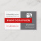 Fotograf graue, weiße, rote Visitenkarte mit weißer Fotokamera auf grauem, weißem Hintergrund und einem roten Band mit dem Text Fotograf. Eine großartige berufliche Visitenkarte für Fotografen oder Fotografen.