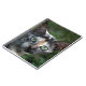 Graubraun-weiße Katze mit grünen Augen Notizblock