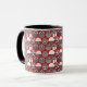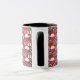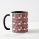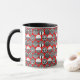 Diese Tasse hat ein geometrisches Design von Ovalen mit verschiedenen Mustern in Grau in jeder Hälfte, alles auf einem Feld rot.