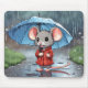 Niedliche graue Maus mit einem roten Mantel, der einen Regenschirm hält