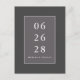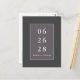 Schlicht und modern, diese einfache Hochzeit Save the Date Karte hat fett vertikalen Text mit Ihrem geplanten Hochzeitstag und der Name der Braut und Bräutigam auf der Vorderseite der Postkarte. Ein zweifarbiger grauer Hintergrund kontrastiert mit dem knalligen weißen Text. Auf der Rückseite der Postkarte befindet sich eine Textvorlage mit einer Beispielmeldung und einem anderen Text, der Ihnen ermöglicht, Ihre Daten zu personalisieren.