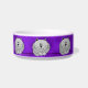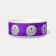 Diese personalisierte Haustierschüssel der niedlichen kundenspezifischen Keramik hat wunderliche graue fette Cartoonkatzen, mit seinen Tatzen, die darunter verstaut werden und seinem Schwanz zu sitzen, der herum, auf einem lila Hintergrund eingewickelt wird. Es gibt mehrere von ihnen um den Teller.