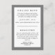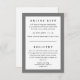 Klassischer Typ und ein eleganter Farbrahmen geben dieser Kombination aus Antwort- und Registrierungsinformationen-Karte die Vielseitigkeit, sich in alle möglichen Einladungen zu integrieren, einfach die Hintergrundfarbe und Zeilenfarbe an Ihre Veranstaltungsfarben anzupassen. Vergessen Sie nicht, den Text zu personalisieren und Ihren Gast zu Ihrem Online-Hochzeitsrabatt und Ihren Registrierungen zu leiten.