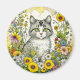 Volkskunst ist eine Kunst, die eine niedliche, graue und weiße Katze darstellt, die in den Blume Gelb und Weiß sitzt.