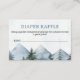 Winter-, Wilderness-Themen-Baby-Party-Windel-Raffle-Ticket mit einigen Bergen und Kiefern sowie schwach gefärbten Schneeflocken. Diese Baby-Party-Windel-Raffle-Karte ist ideal für eine Winter-Baby-Party.