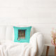 GRAUER STAHL-CONTAINER AUF FENSTER MIT AQUAMARINEM KISSEN