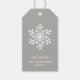 Maßgeschneiderte, bedruckte Geschenkanhänger mit einem schlichten weißen Schneeflocke auf grauem Hintergrund. Verwenden Sie die Designtools, um den Text zu bearbeiten, die Schriftart und Farben zu ändern oder Ihr eigenes Foto hochzuladen, um Ihre eigenen personalisierten Weihnachtsgeschenktags zu entwerfen.