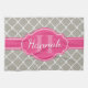 Stilvolles, trendiges, grau-weißes Gittermuster im Hintergrund, ergänzt durch ein hellrosa Etikett mit individualisierbarem Namen und Monogramm-Vorlage.