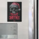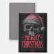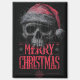 Das kühne und grungy grafische Design mit einem hochdetaillierten, von Hand gezeichnet Schädel, der bedrohlich mit einer bedrückten roten Weihnachtsmannmütze gekrönt ist. Die Abbildung hat ein schweres, strukturiertes und leicht ausgeprägtes Erscheinungsbild, Set vor dunkelgrauem Hintergrund. Unter dem Schädel werden die Worte "MERRY CHRISTMAS" in prominenter, stilisierter roter Typografie präsentiert. Dieses Design bietet eine einzigartige Alternative zur Ferienzeit.