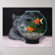 Eine schöne, graue, blaue, langhaarige Katze sieht intensiv in eine runde Goldfischschüssel. Er hat ein großartiges Auge und Gesicht, während er den Fisch anstarrt. Der Goldfisch sieht verblüfft aus, als er über den vielen bunten kleinen Kieselsteinen schwimmt.