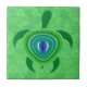 Eine grüne Meeresschildkröte mit einem blauen Auge im Rücken. Die Fliesen sind in zwei Größen erhältlich: 4,25 x 4,25 Zoll und ein großer 6 x 6 Zoll.