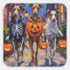 Adorable Windhunde, die in verspielten Halloweenkostümen gekleidet sind, tragen Kürbiseimer, während sie unter dem mondbeleuchteten Himmel tricksen oder sich behandeln. Dieses festliche Design hebt den schlanken Körper der Rasse, die anmutige Haltung und die sanfte Persönlichkeit hervor, die perfekt die gespenstische und dennoch lustige Atmosphäre Halloween-Abends einfangen. Ein stilvolles Fest für Hundefreunde und Halloween-Fans gleichermaßen.