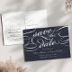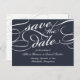 Elegante Save the Date Postkarten in Blau und Weiß um Mitternacht verzieren die Kalligraphie-Schriftzeichen für ein klassisches, formales Aussehen. Personalisieren Sie die Rückseite mit Ihren Hochzeitsdetails, einschließlich Namen, Datum, Ort und zusätzliche Informationen wie Ihre Hochzeitswebsite. Platz für Ihre vorgedruckte Rücksendeadresse.