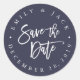 Die eleganten und modernen Save the Date Aufkleber sind mit ihren Namen und ihrem Hochzeitstag in kreisförmigen Schriftzügen, die "Save the Date" in der weißen handgeschriebenen Pinseltypografie enthalten, versehen. Mitternachtsblauer Hintergrund ist auffallend und elegant, um Ihre Save the Date Mailings perfekt zu beenden!