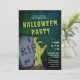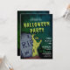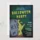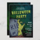 Dieses moderne Halloween-Party lädt mit grüner Zombie-Hand ein, die aus einem Grab in einer beängstigenden Friedhofszene ausreicht. Die Typografie ist lustig, aber spukhaft. Dies ist die ideale Einladung für ein lustiges Halloween-Party!