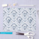 Elegantes klassisches, blau-weiße Blumenmuster mit Windmühle und Segelbootsvignetten in verzierten Medallions aus Rokoko mit Garnelen aus Rose und wirbelnden Weinreben. Das Muster ist nahtlos und kann nach oben oder unten skaliert werden.