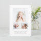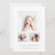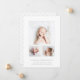 Klassische Kinderankündigungskarte mit minimalistischem Design mit einer Collage aus Foto mit drei Ihrer Lieblingsfotos. Unten sehen Sie den Namen des Babys, die Geburtsdaten und die Namen der Eltern. Der Rücken weist ein einfaches, grau-weiße Streifen-Muster auf. Dieses elegante Design ist eine großartige Möglichkeit, die Ankunft Ihres Babys anzukündigen.