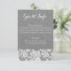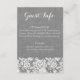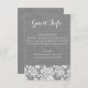 Burlap und Lace Information Card für eine Rustikale Hochzeit in Grau. Holen Sie sich diese Karte für Ihre Country chic Hochzeit und fügen Sie alle kleinen Details für Ihre Veranstaltung. Sie können den gesamten Text bearbeiten und verschieben, wo Sie möchten. Auf der Rückseite befindet sich ein Rutschhintergrund.
