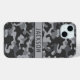 Customize this gray camouflage iPhone 15 plus case with your name in a trendy modern CAP font in dark gray on light gray. It's masculine and perfect for your favorite military, hunting, country or outdoorsman!