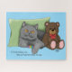 Niedliche britische Kurzhaarkatze, die mit einem Katzenspielzeug und einem Teddybär sitzt. Die Katze hofft, dass ihr vorheriger Unfug, in den sie got haben, dem Hund beschuldigt wird.
