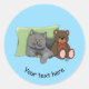 Niedliche britische Kurzhaarkatze, die mit einem Katzenspielzeug und einem Teddybär sitzt. Die Katze hofft, dass ihr vorheriger Unfug, in den sie got haben, dem Hund beschuldigt wird.