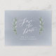 Moderne schicke Kalligraphie Save the Date mit Aquarellgrün-Design auf farbenprächtigem, staubblauen Hintergrund, einfach und elegant, ideal für rustikale Hochzeiten, Frühjahrshochzeiten und Sommerhochzeiten. Alle passenden Teile in der Sammlung anzeigen