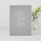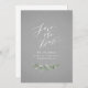 Moderne schicke Kalligraphie Save the Date mit Aquarellgrün-Design auf grauem Hintergrund, einfach und elegant, ideal für rustikale Hochzeit, Frühjahrshochzeit und Sommerhochzeit. Alle passenden Teile in der Sammlung anzeigen