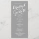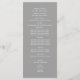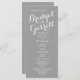 Modernes Textdesign in grau bedrucktem Rack-Karten Hochzeitsprogramm mit weißem Text.