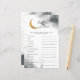 Niedlich über das Thema Mond Baby Dusche Baby Wort Rührei Karte mit Aquarell in grau mit Imitaten goldenen Mond und Sterne. Die Wortliste auf dieser Karte bezieht sich alle auf Babys und sie werden verdreht. Die Gäste werden konkurrieren, die sie alle zuerst auspressen können! ANTASTATUR: 1. Kindersitz 2. Milch 3. Laufgitter 4. Schnuller 5. Diaper 6. Schaukelstuhl 7. Kinderzimmer 8. Babymonitor 9. Sattel 10. Formel 11. Gummiklemme 12. Rolle.