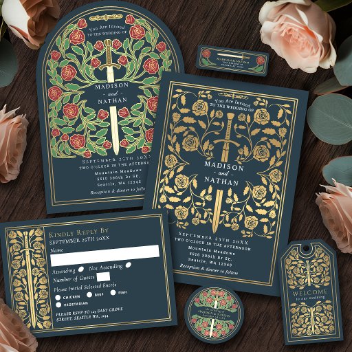 Celebrate your special day with these royal medieval sword wedding napkins against a gray background. You can customize this further by clicking on the "PERSONALIZE" button. PLEASE NOTE: The gold on this item is NOT real foil and is printed in flat colors